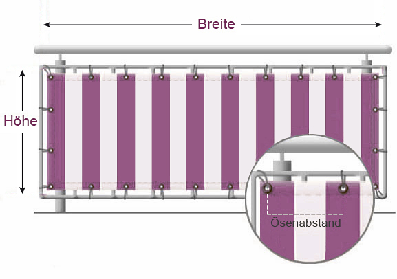 - Für einen Balkonsichtschutz mit Ösen, der mithilfe von Kabelbindern befestigt werden soll, ziehen Sie von der gemessenen Höhe und Breite jeweils ca. 2cm ab.