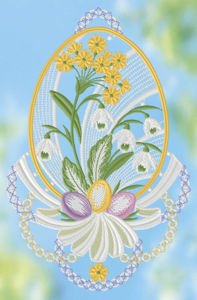 Fensterbild aus Plauener Spitze® - Osterei mit Maiglöckchen #1W mehrfarbig