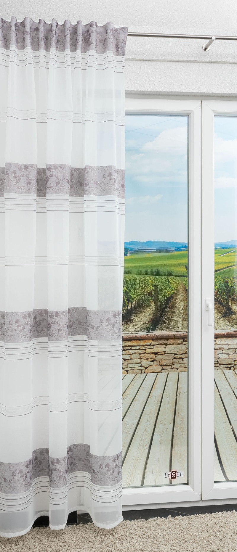 Dieses transparente Raffrollo in Weiß fällt vor allem durch die dekorativen, senkrecht verlaufenden Streifen in Naturfarben auf, die sich auf dem Stoff in natürlicher Leinenoptik besonders schön präsentieren und sich auch durch ihre eigene Struktur von diesem abheben. Das gestreifte Gewebe besteht aus Trevira CS und Polyester und fügt sich durch das schöne, aber zurückgenommene Design in viele Wohnumgebungen ein und verleiht ihnen einen modernen Charme. Die Bedienseite für die Zugschnur, mit der Sie die Raffung verändern können, ist rechts; die Aufhängung erfolgt anhand einer Flexoschiene mit Klettband. Den Rolloabschluss bildet ein Tunnel mit Beschwerungsstab. Das durchscheinende Gewebe schirmt blendende Sonnenstrahlen ab und lässt dabei viel Licht hindurch, wovon vor allem kleine Zimmer und solche mit niedrigen Decken profitieren und mit diesem Fensterbehang größer, weiter und offener wirken.