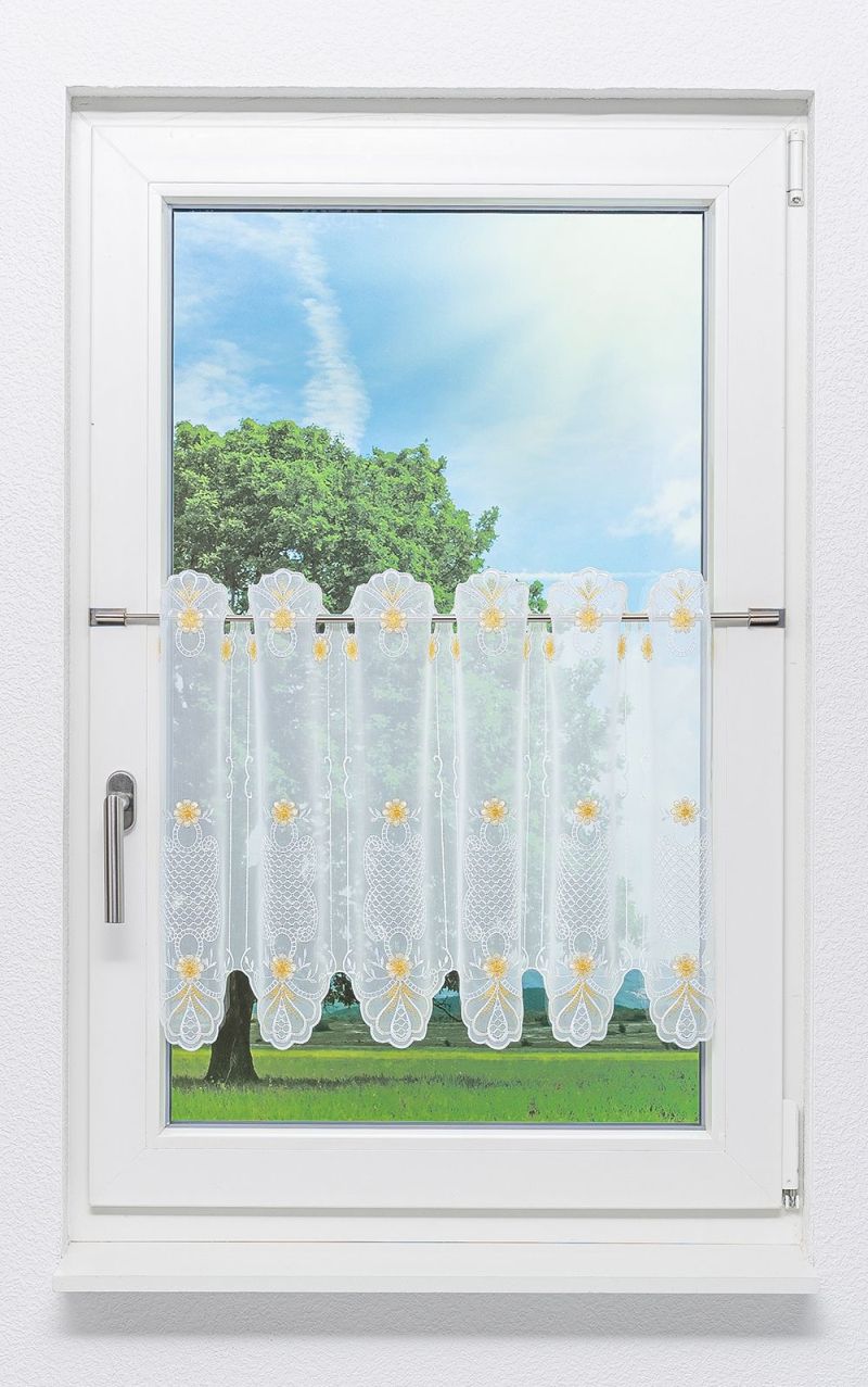 Die prachtvollen Blumen wirken fast so, als befänden sie sich in einer Sanduhr. Die floralen Elemente erinnern an den gelben Sonnenhut und ranken sich schwungvoll nach oben. Eingefasst in ein Spitzengeflecht und umgeben von dekorativen Ornamenten ist diese Scheibengardine eine ausgesprochen geschmackvolle Zierde für Ihr Fenster. Als Bistrogardine in der Küche sorgt sie dort für ein freundliches Flair. Das lockere, transparente Gewebe lässt den Lichteinfall weiterhin zu und schafft ein helles, offenes Ambiente. Durch die Ornamente am oberen Abschluss wird die Gardinenstange hindurchgefädelt, somit ist der Stoff einfach und schnell ins Fenster gehängt. Angelehnt an den Rapport von 16,2 cm bieten wir das Modell in unterschiedlichen Breiten an.