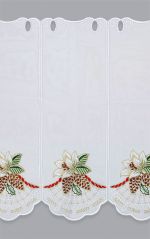 Auf dieser weißen Scheibengardine zieht das Arrangement durch die Weihnachtsfarben Gold, Rot und Grün alle Blicke auf sich. Auch in dem Muster am unteren Abschluss greifen Gold und Weiß ineinander. Der prachtvolle und mit viel Liebe zum Detail geschmückte Behang verleiht dem Raum eine besondere und festliche Atmosphäre. In Ihre Weihnachtsdeko mit Bordeaux, dunklem Grün und glitzernden Details fügt sich das Modell harmonisch ein.