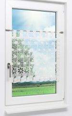Mit dieser Scheibengardine erblüht eine wahre Blumenpracht am Fenster. Ganz besonders eindrucksvoll sind die Schlaufen, die aus aneinandergefügten, gestickten Blüten bestehen. Dazu kommt der Mix aus unterschiedlichen Mustern und Strukturen, die allesamt eine schwungvolle Umrandung haben. An Spitzengeflecht, an Sedimentgestein oder Bewegungen einer Wasseroberfläche erinnern die unterschiedlichen Elemente dieser Scheibengardine. Weiteres Highlight ist die große Blume, die fast zwei Drittel der Fläche einnimmt. Mit großen Blättern und einem einzelnen Blatt zieht sie alle Blicke auf sich, kommt dabei ganz ohne Muster aus. Durch die immer wiederkehrenden schwungvollen Linien wirkt das Design der Bistrogardine in sich harmonisch. Der Behang ist eine schmuckvolle Zierde für das Fenster, der Lichteinfall verändert sich dadurch kaum. Da in den oberen Abschluss Aussparungen für den Stangendurchzug eingefügt wurden, lässt sich der Stoff im Nu auf eine Klemmstange, Pinn- oder Vitragenstange aufziehen.
