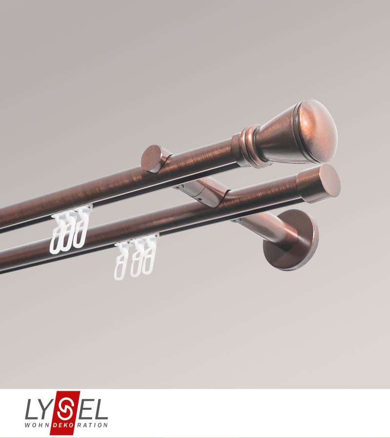 Dieses Set beinhaltet neben den runden Metallstangen auch Doppel-Kombiträger aus Metall, Befestigungsmaterial und Klickgleiter aus Kunststoff, die an jede Stelle der Innenläufe eingesetzt werden können. Die konusförmigen Endstücke mit den beiden Einkerbungen unterstreichen den modernen und reduzierten Charakter dieses Zubehörs. Während diese mit dem beiliegenden Innensechskantschlüssel fixiert werden müssen, genügt bei den schlichten Endkappen der hinteren Stange ein einfaches Aufstecken. Die Kombiträger werden an die Wand geschraubt, die Stangen anschließend von unten in die halbrunden Öffnungen eingesetzt. Ab einer gewissen Länge sind außerdem Verbinder im Lieferumfang enthalten, mit welchen Sie die einzelnen Gardinenstangen zusammenführen. Auf Wunsch kürzen wir diese gern auf das passende Maß.